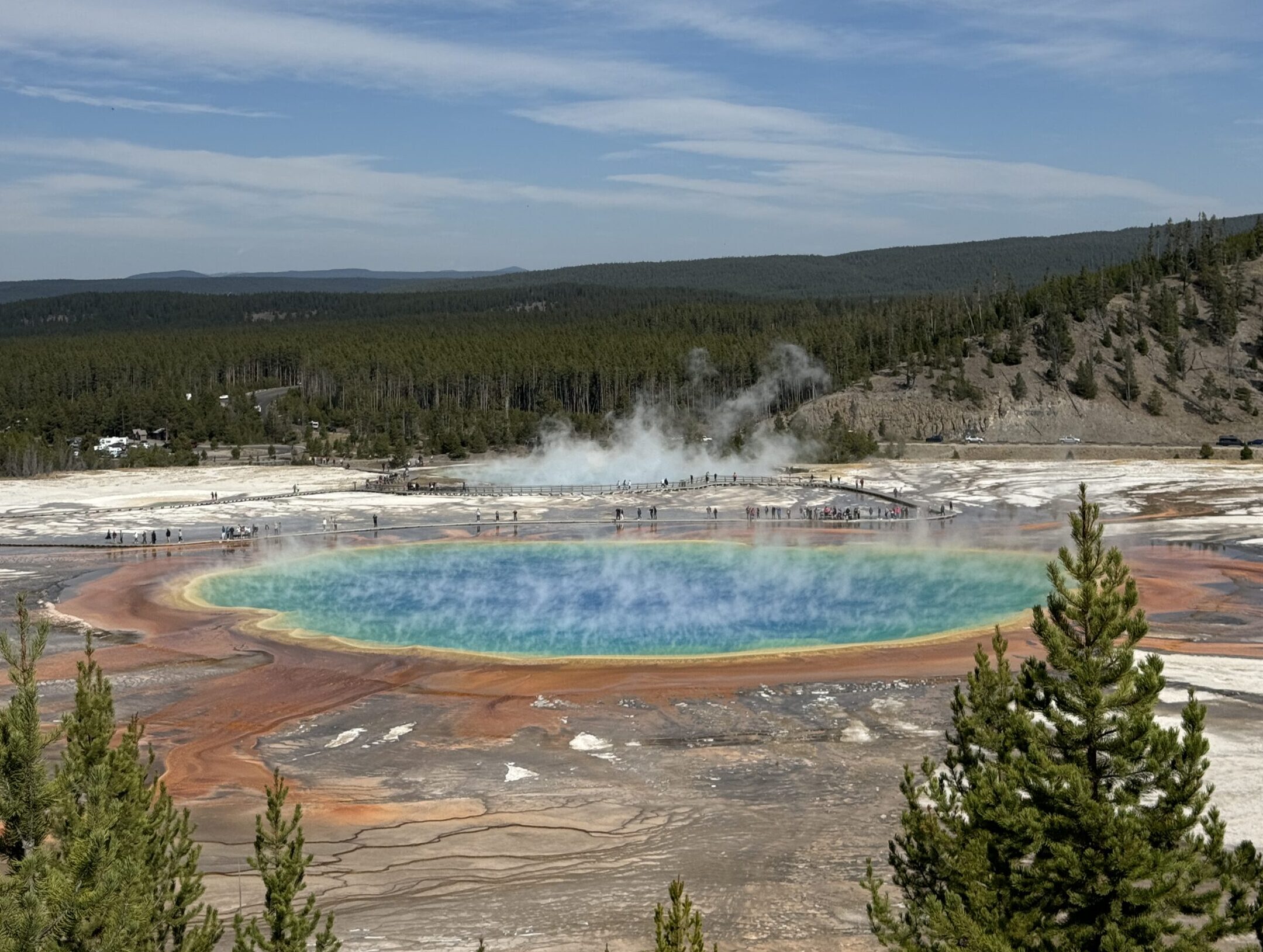 Grand Prismatic Spring, Yellowstone’s most photographed thermal feature, is a natural masterpiece of stunning colors and immense scale. This massive hot spring, larger than a football field, displays brilliant rings of orange, yellow, and blue caused by heat-loving microorganisms. Steam dances across its surface while the deep blue center reaches temperatures near boiling. Boardwalks and an overlook platform offer breathtaking views of this rainbow-hued wonder, which appears to shimmer against the backdrop of white travertine terraces.